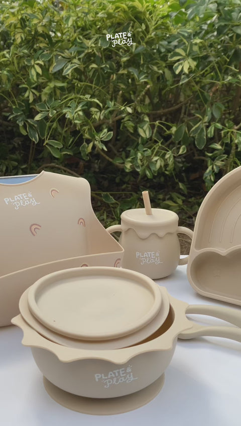 We specially curated this cutlery set to be as functional and practical as they are aesthetically-pleasing. Each 5-piece set consists of: Rainbow Suction Plate with lid (handy for leftovers to pop into the fridge!) Sunshine Suction Bowl with lid Rainbow fork and spoon Honey Pot Drinking Cup with Straw Catch-All Bib.